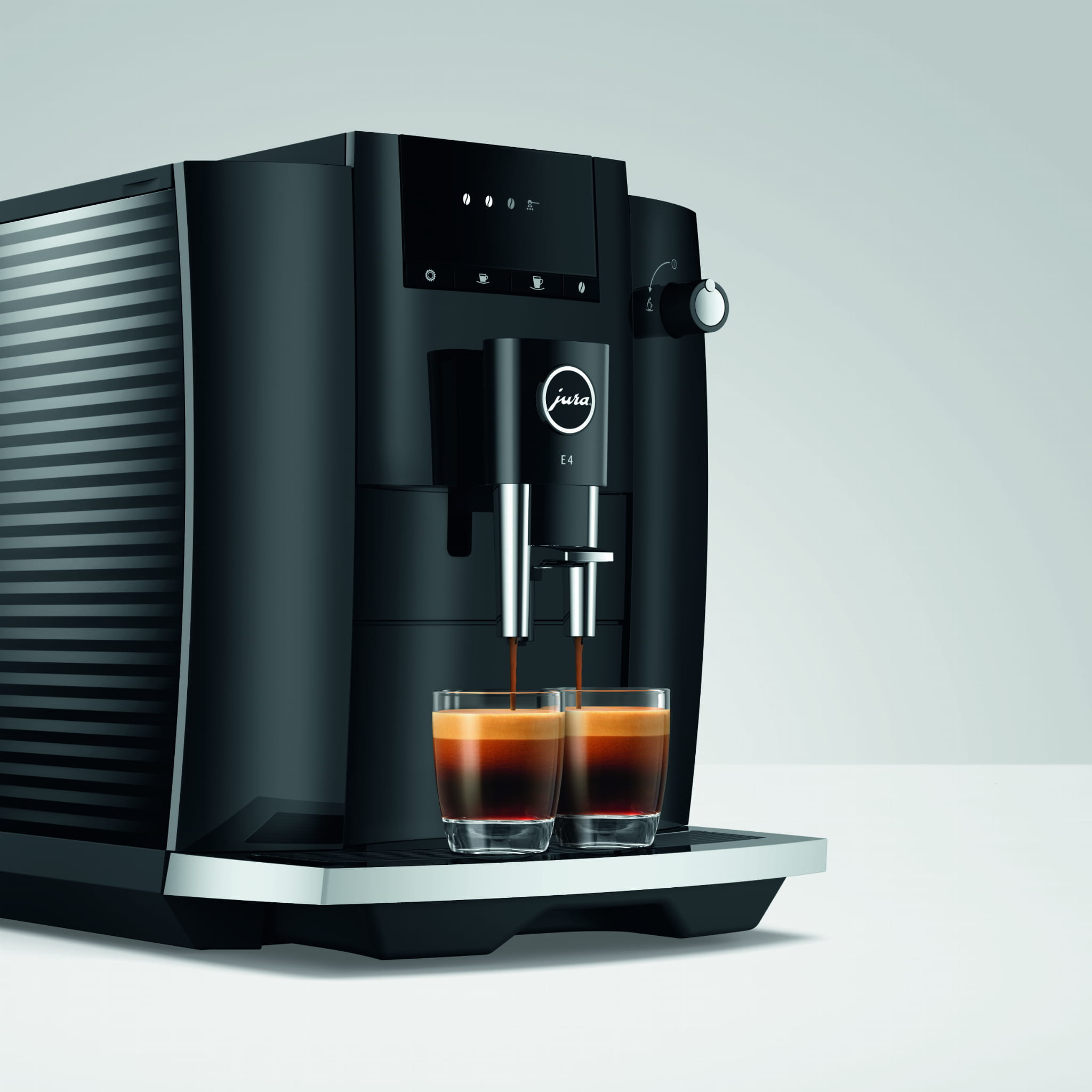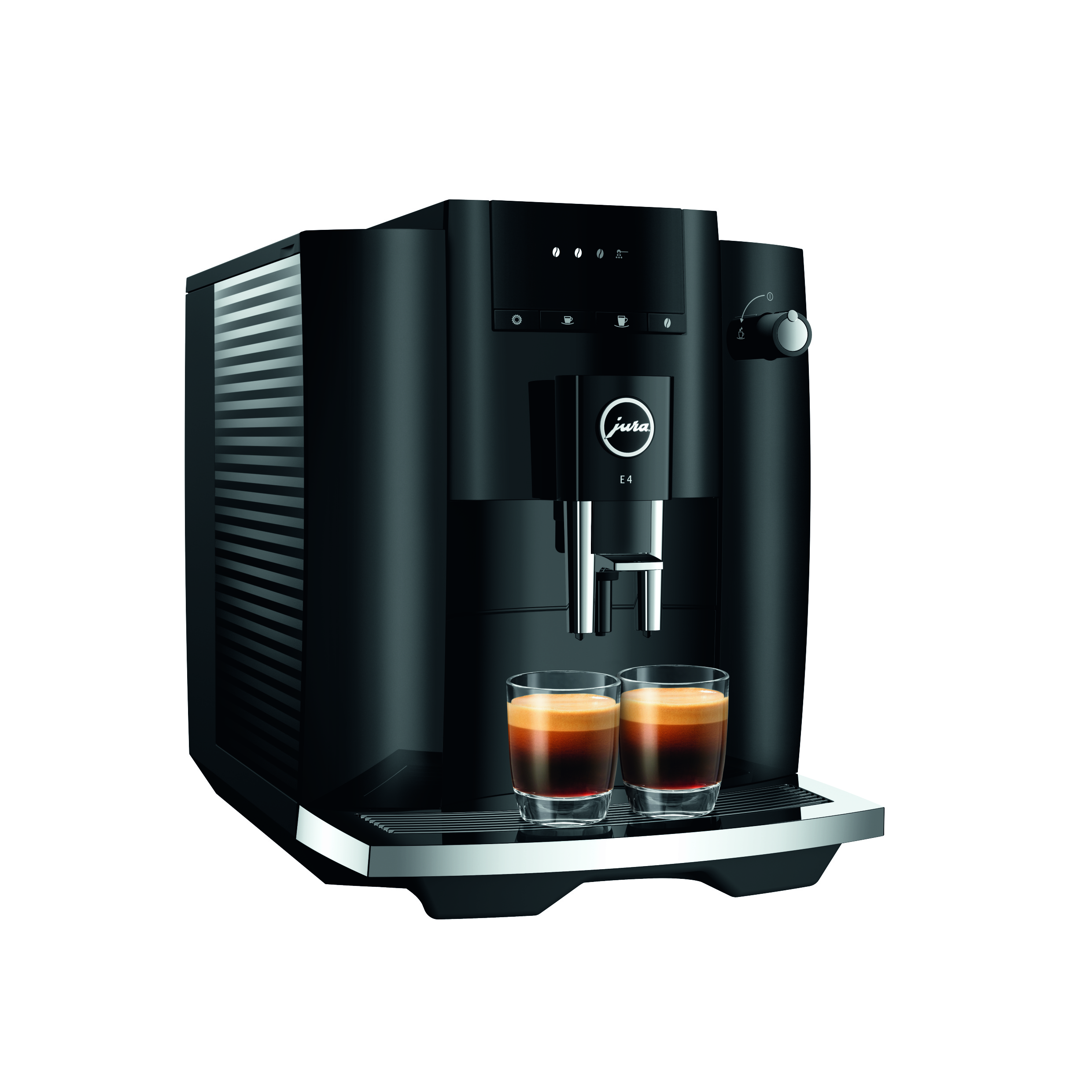 E4 wyróżnia się wzornictwem charakterystycznym dla ekspresów automatycznych JURA. Jednoczy jasno zarysowane powierzchnie i wyraziste linie. Najwyższa precyzja wykonania i prosta forma świadczą o jakości klasy Premium tego ekspresu automatycznego. Puryzm przejawia się też w doborze kolorów. Podczas gdy cały korpus jest utrzymany w powściągliwym kolorze Piano Black, chromowane elementy nadają mu subtelne akcenty i tworzą kontekst dla doskonałych rezultatów parzenia kawy.