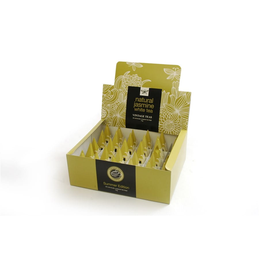 Vintage Teas przedstawia czystą zieloną i czarna herbatę cejlońskaą, zmieszaną z pączkami jaśminu zapakowana w fantazyjne pudełko.